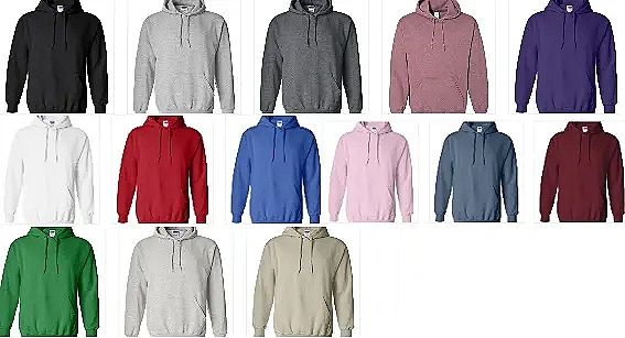Selection of these colors for Hoodies are available for production as soon as your order is placed. Black, Sports Grey, Heather Dark Grey, Heather Maroon, Purple, White, Red, Royal, Light Pink, Indigo Blue, Garnet, Irish Green, Ash or Sand. Available in sizes S-2XL